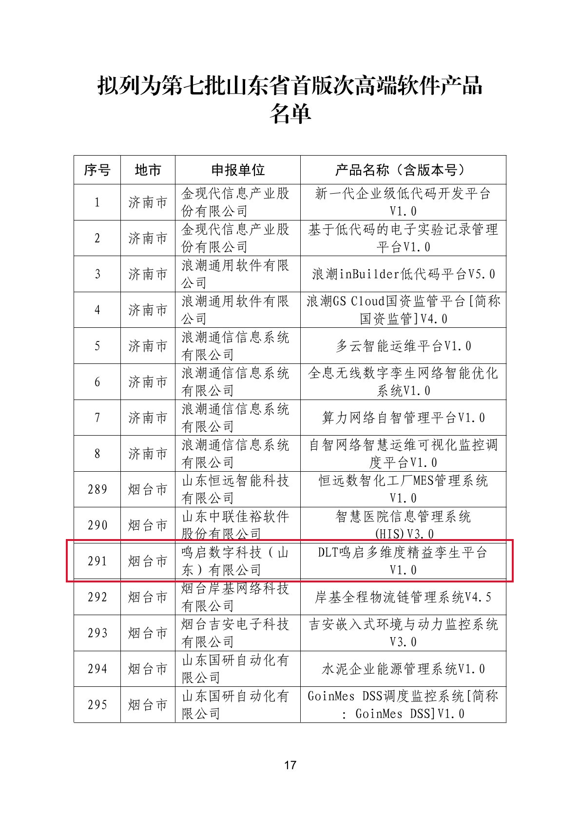 鸣启DLT入选2023第七批山东省首版次高端软件产品名单